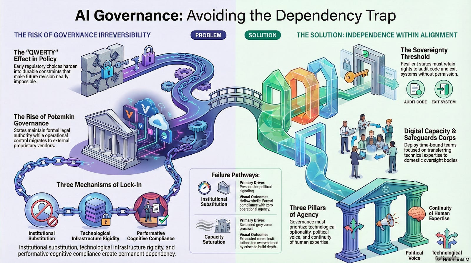 The central challenge is therefore not regulatory ambition, but premature rigidity. When governance choices harden before domestic audit capacity, technical visibility, and exit options are established, states may find themselves aligned in form but dependent in practice—responsible for systems they cannot meaningfully interrogate, adapt, or redirect.